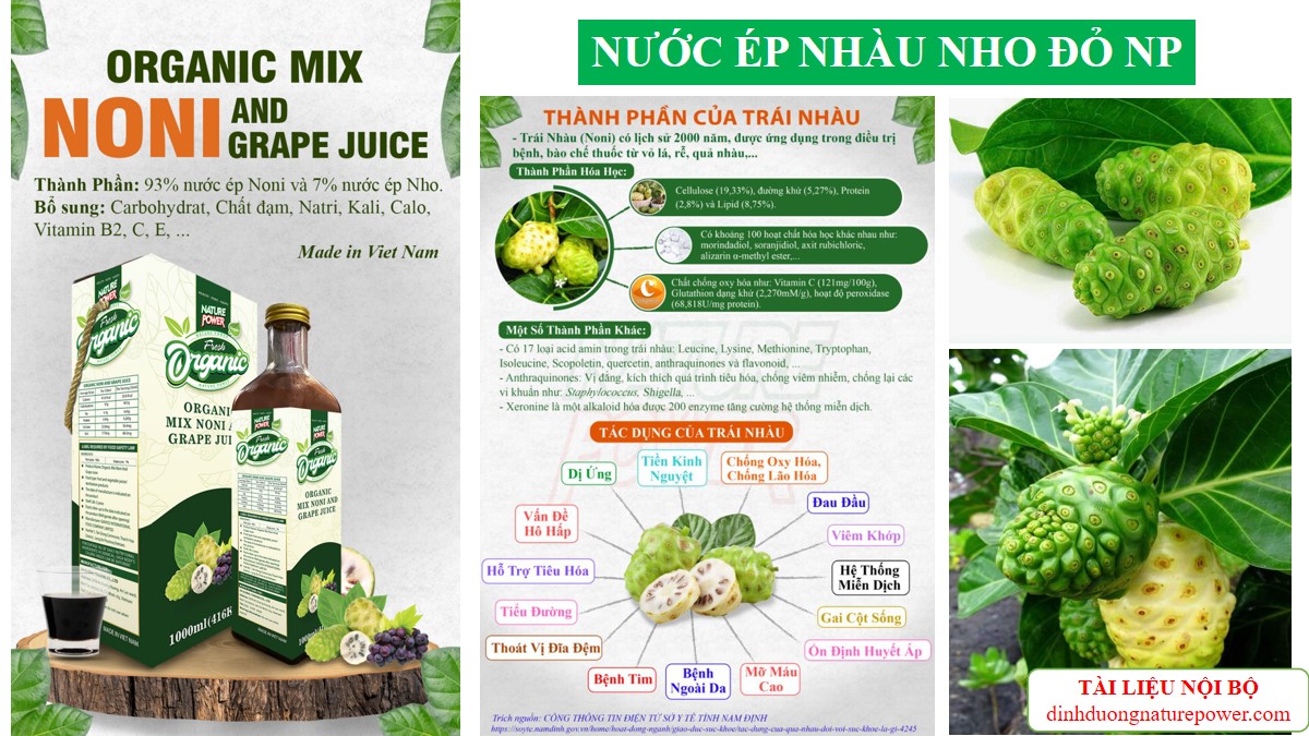 Dòng sản phẩm "Nước Ép Nhàu Hữu Cơ" chiết xuất từ trái nhàu nguồn dược liệu quý từ thiên nhiên, giúp chăm sóc xương khớp, kháng viêm, chống lão hóa, tăng cường miễn dịch. Sản phẩm sử dụng công nghệ cao để giữ lại các chất dinh dưỡng và xử lý mùi nồng của trái nhàu để người dùng dễ sử dụng.